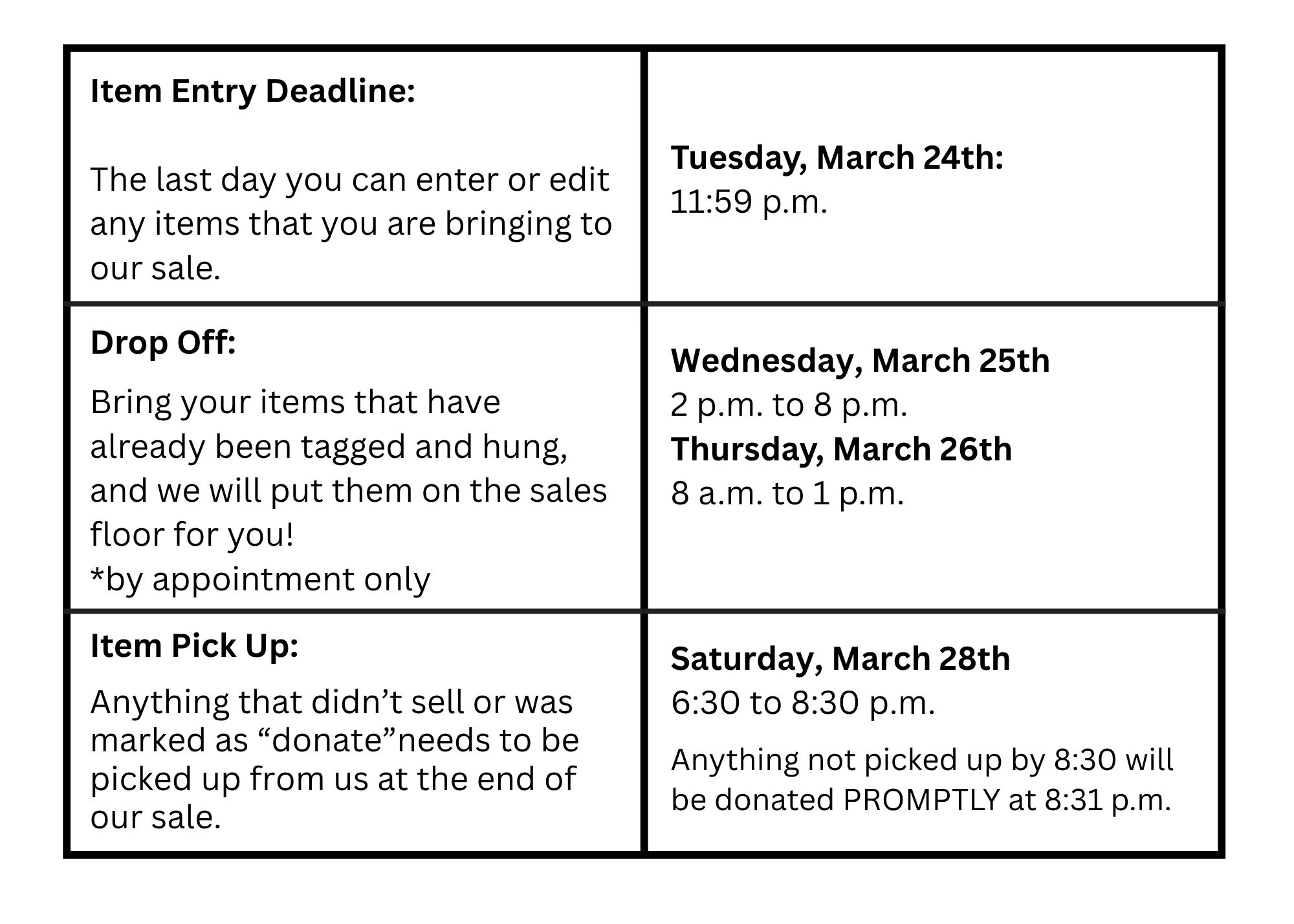- ALL unsold items that you have not already donated MUST be picked up on Saturday by 8:30 pm.