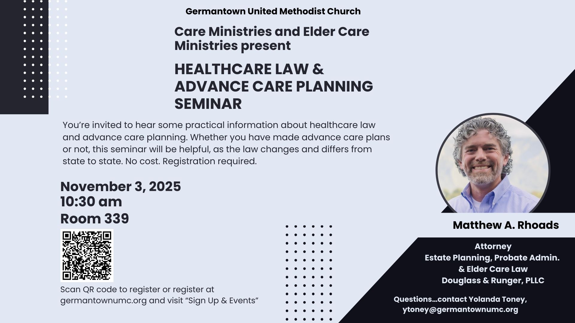 You’re invited to hear some practical information about healthcare law and advance care planning. Whether you have made advance care plans or not, this seminar will be helpful, as the law changes and differs from state to state. No cost. Registration required.