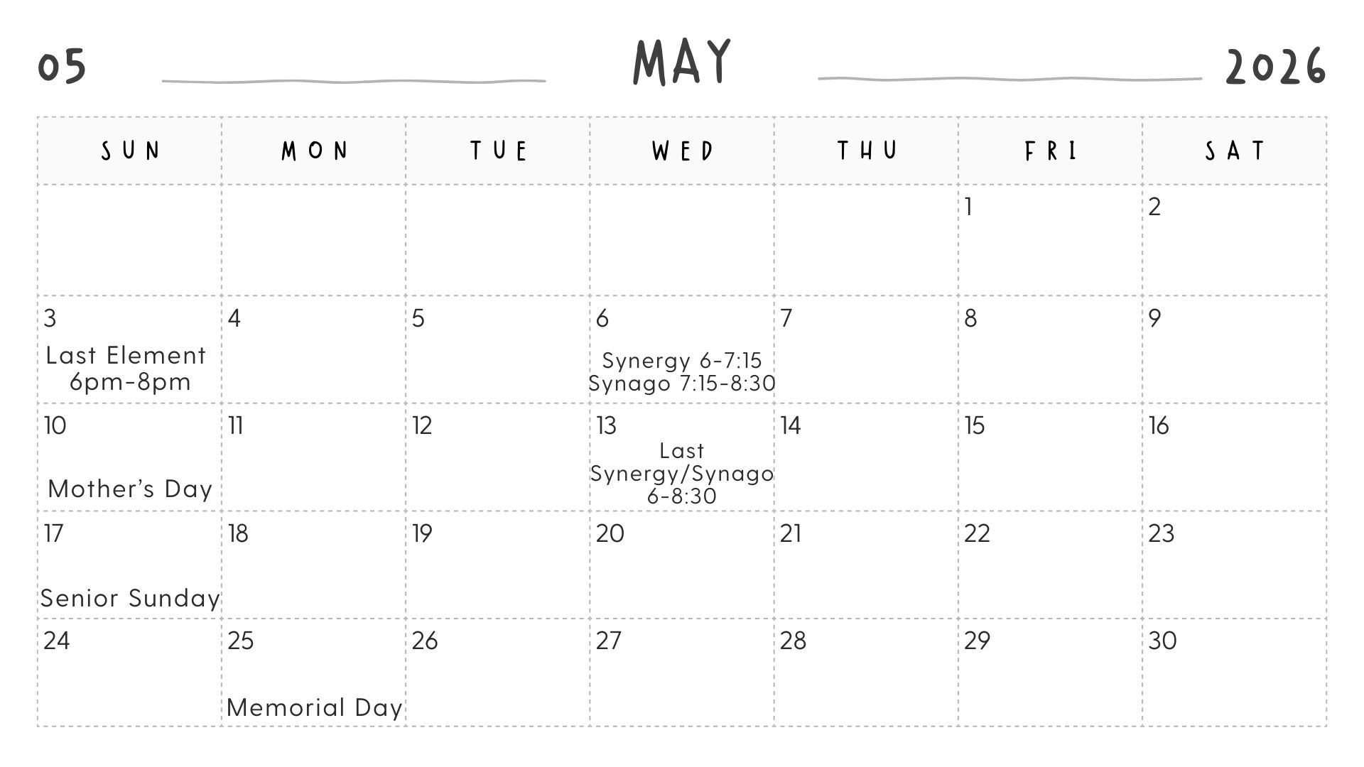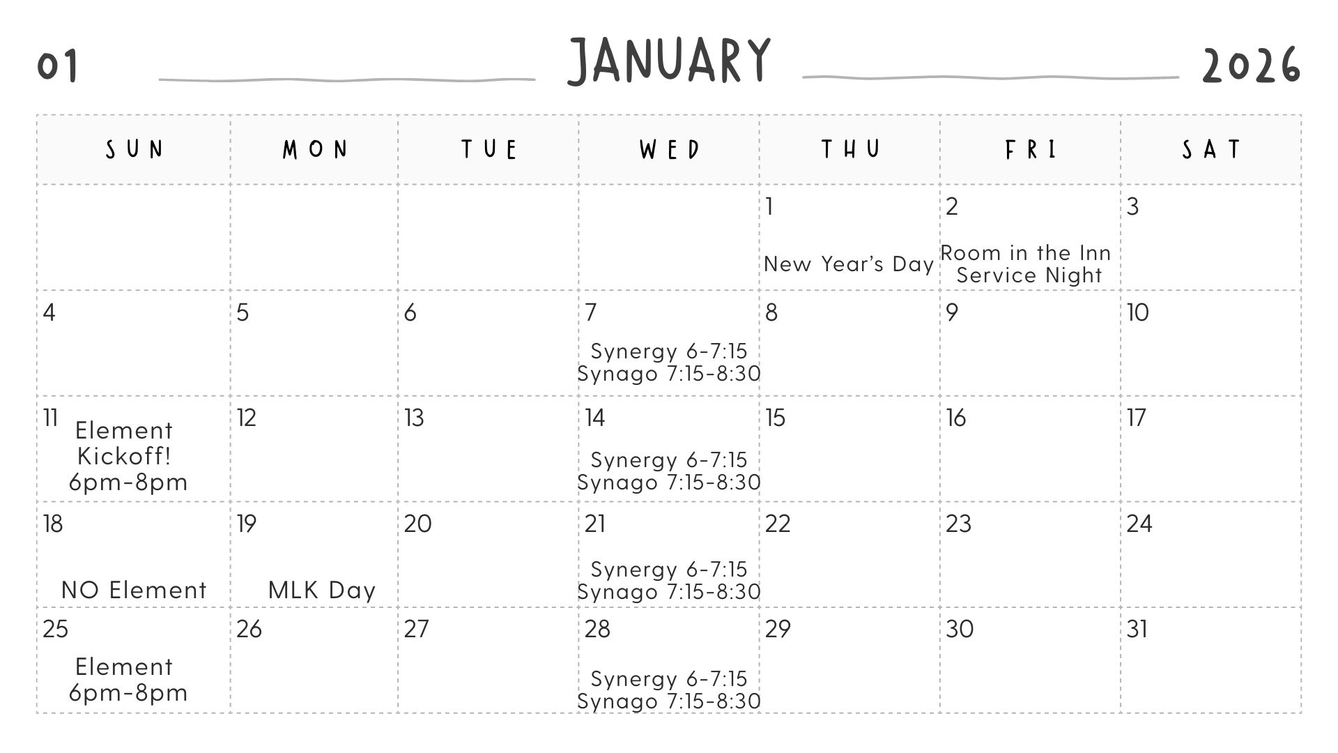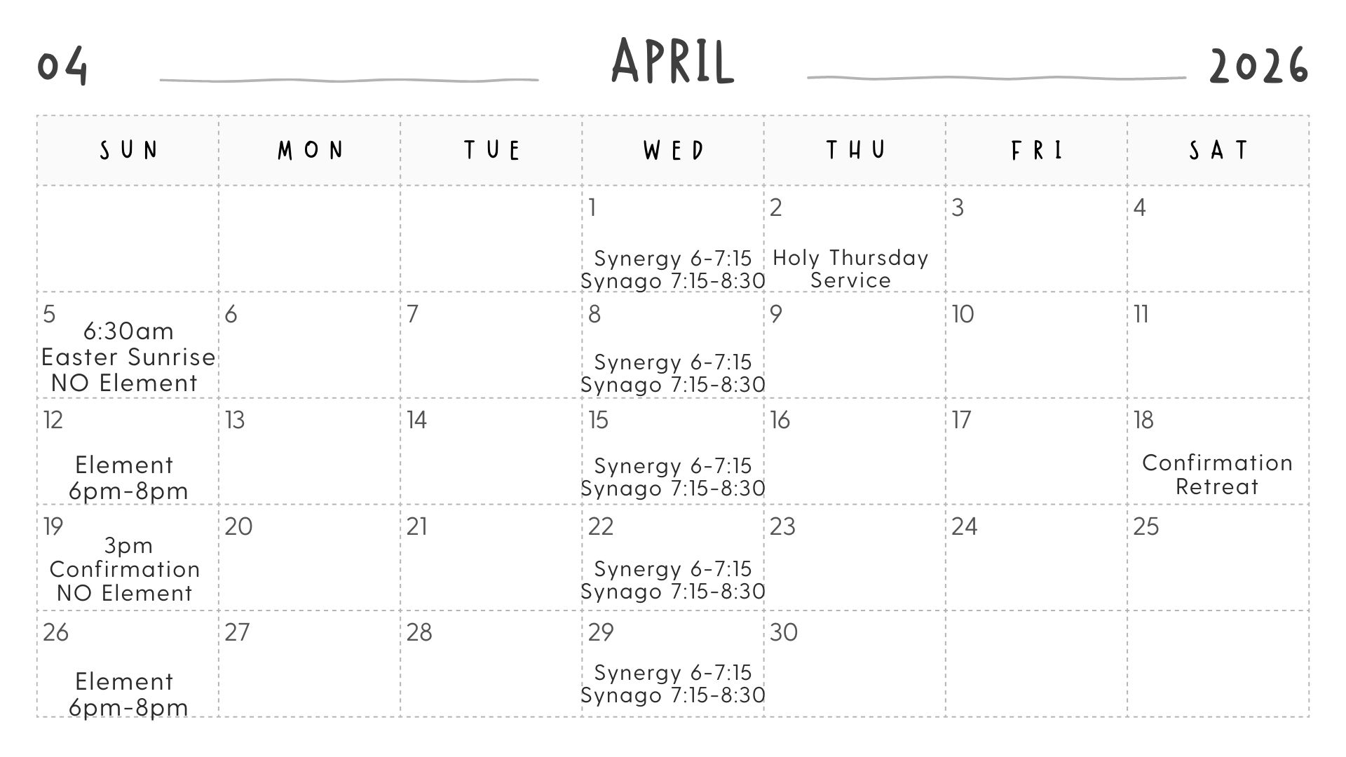 Synago: 9th-12th graders are invited to join us from 7:15 pm – 8:30 pm in the Oasis for snacks, Bible Study, and fellowship!