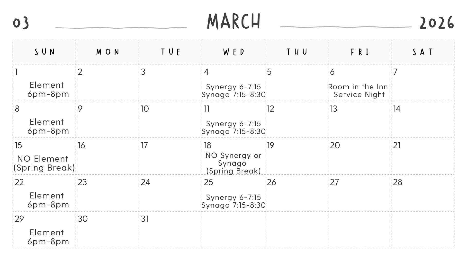 Element: Join us for food, games, worship, and small group on Sunday nights at 6 pm – 8 pm in the OLEC.  6th-12th graders are welcome–please bring 5 dollars to help cover dinner costs. –Check Calendar below for Element schedule!–